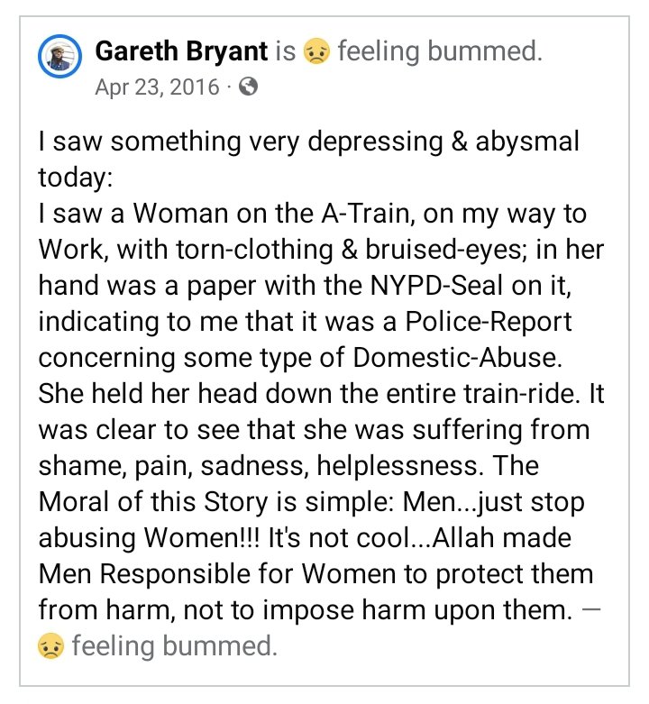Ever since I became a Chaplain: I’ve personally counseled People (Men & Women alike), who’ve suffered via Abuse. Contrary to Popular-Opinion: a. Abuse doesn’t exclusively affect Females/Women. b. Abuse isn’t always physical. c. People don’t deserve to be abused via any Way. Sadly, especially amongst Muslims: there’s verly little Resources, not enough Resources, etc. given to Muslim-Demographics to educate&empower Others to combat Abuse in a Positive/Constructive-Way. Referring to the Aforementioned, detailing the Post about me seeing someone brutalized: it’s something which scared my Mind/Heart, as has Other-Recollections of Unjust-Violence against Others. And, there’s literally 0 that Certain-People are willing to do about it. Now, pertaining to the Person whom I saw…I didn’t know them, don’t know whether they were able to escape their Abuser, don’t know whether their Abuser got arrested, etc. But, here’s what I know for a Fact: Abuse stays with People, potentially for as long as they live & especially if they don’t receive the Necessary-Resources to help them heal from their Trauma.