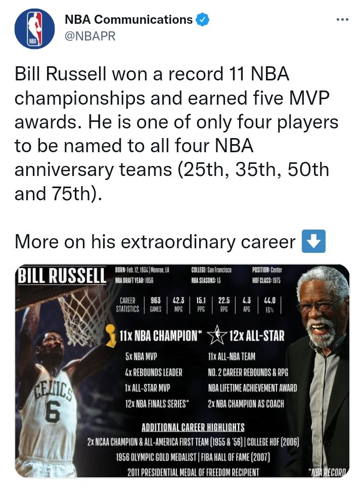 In addition to being the GOAT of the NBA, Bill Russell was also one of the Unsung-GOAT’s of the Civil-Rights Era via the United States virtually the Entirety of their Professional-Career in the NBA. They were a Frontliner, with the Likes of: Jim Brown, Cassius Clay/Muhammad Ali, etc. These Great-Men whom dominated their respective Sports-Domains also put their Lives, their Safety, the Safety of their Families, Careers on the Line on a Daily to improve the Human-Condition of Afro-Americans via the Pursuit of Equality, Equity, Justice.