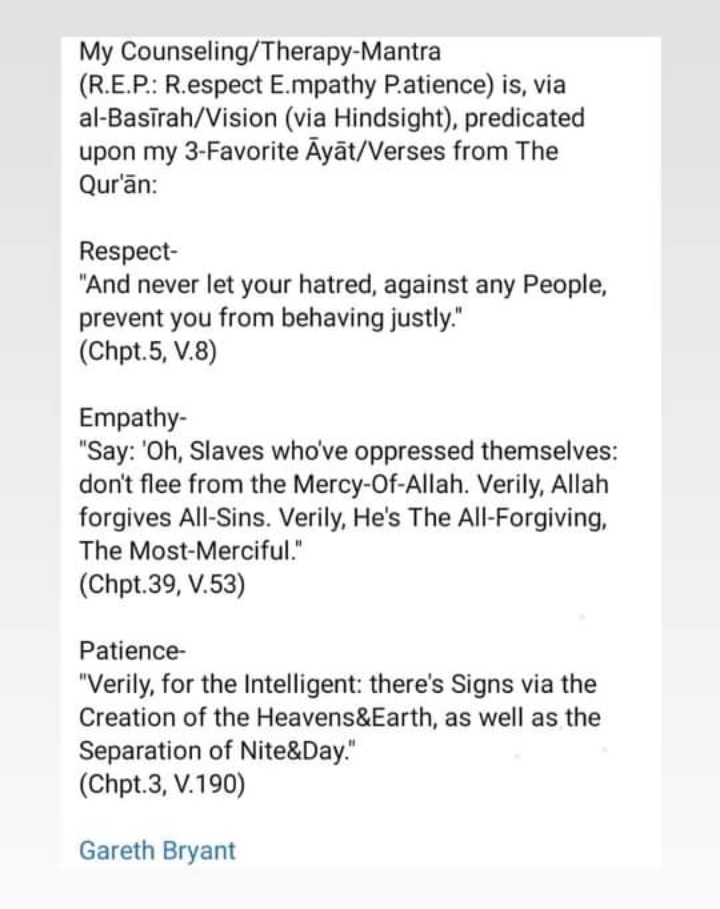Gareth Bryant has been a Chaplain/Imām since 1435, A.H./2014, C.E. They studied Islamic-Studies & the Arabic-Language under Siraj Wahhaj (Imām of Masjid at-Taqwa), Fiqh (Islāmic Legal-Analysis) under Shakiel Humayun (Founder of Foundation for Knowledge and Development [FKAD]), Sīrah (Biography/Life of Muhammad) & Mustalah-ul-Hadith (Authentication of Narration), under Abdul-Rahman Khan (Executive-Member of the Fiqh Council of North America), `Ulūm-ut-Tafsīr (Qur’ānic-Commentary Science) as an Online-Student of Bilal Philips (Founder of International Open University [IOU]).