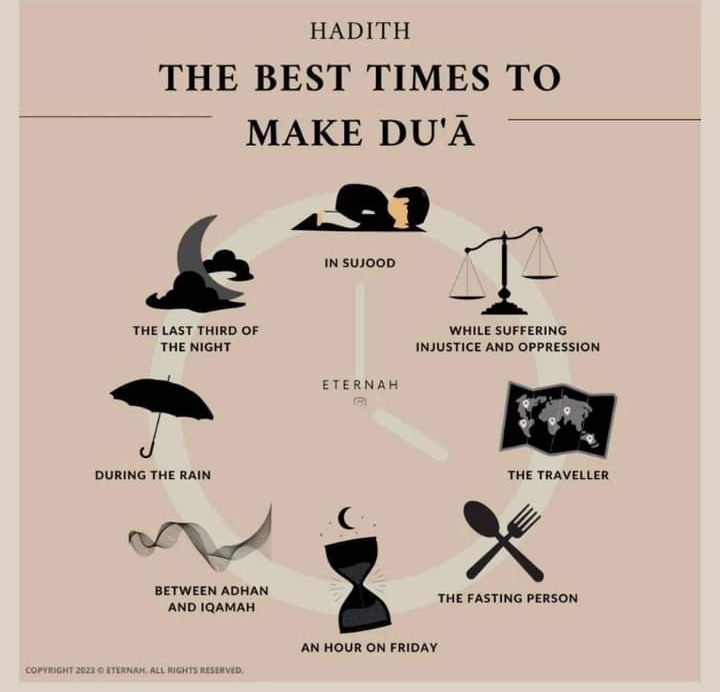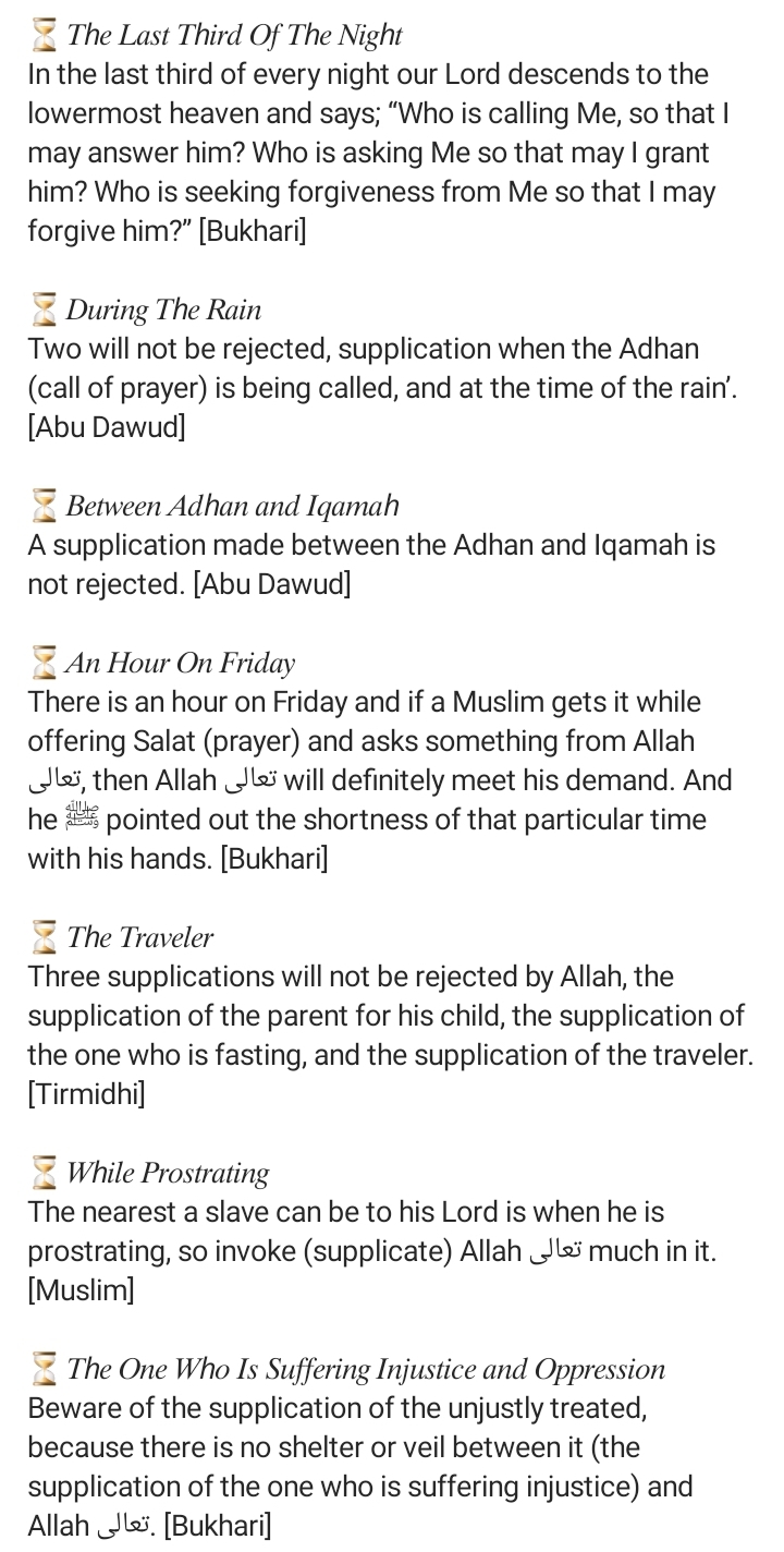 Having Access to this Type/Kind of Info. is vital. It’s ultimately crucial, for us as Muslims, to learn/know the Optimal-Times/Moments which our Ad`iyyah/Verbal-Pleas to Allah are most probable to be accepted. For the Muslim, it behooves us to constantly/consistently be in a 24/7-State of Dhikr/Remembrance of Allah…at least as much as humanly possible that is. The Power-Of-Du`ā’ is never to be overlooked nor underrated.