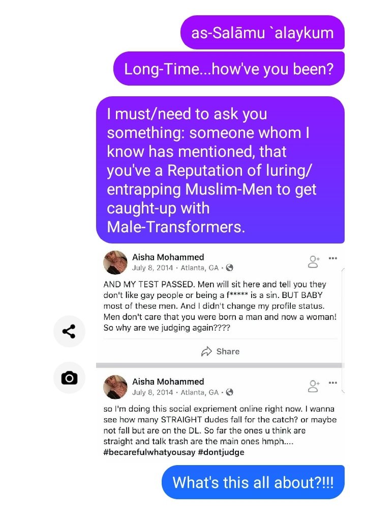 One Particular-Member of our Group posted a Screenshot of someone via Social-Media whom bragged about Sin-Entrapping Others: luring them to engage with Members of the Same-Gender whom pretend to be Members of the Opposite-Gender. In Other-Words: they pontificated being on a Mission, to “expose” Certain-Men (Muslim-Men specifically/especially) for being with Male-Transformers. I, of course, sought to address the Person screenshot directly…I did so. The Reason how/why is because-As per Islāmic-Principle, even if someone is a Public-Fāsiq/Sinner, the Most-Correct Option is to always grant an-Nasīhah/Correction to someone privately firstly. But, if they refuse an-Nasīhah: then they’re to be warned against as per their Evil.