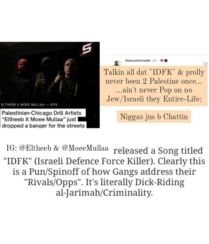 They talkin all this “IDFK” Sucka-Shit, yet ironically: they’ve never killed any IDF-Personnel. They’ve never killed any Islāmophobe who’s ever attacked any Muslim, Masjid/Mosque, Islāmic-Center, etc. They’ve never Popped-On any Corrupt-Cops, Drug-Dealers, Human-Traffickers, Sexual-Predators/Abusers, Gang-Members, etc. In fact, the Only-Thing these Wannabe “Muslim Tough-Guys” do is oppress Fellow-Muslims. This is literally all for Show, to attempt compensating for their own Weaknesses & Incapabilities.
