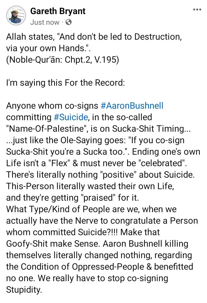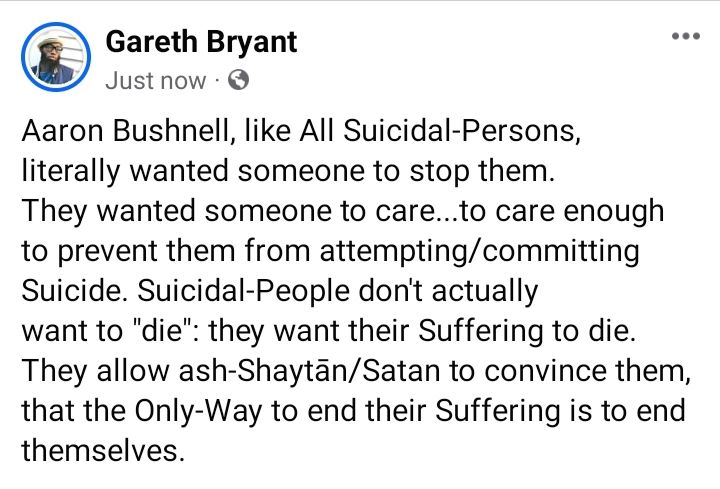 Someone whom I personally know, Hassan Shibly, posted a Video of Aaron Bushnell Moments prior to them setting themselves ablaze…that’s what led to their Self-Demise. I was highly triggered & angered, that so many Persons via Hassan Shibly’s Page audaciously lauded the Self-Destructive Actions of Aaron Bushnell: it was utterly disgusting to say the least. I even commented on Hassan Shibly’s Post, addressing the Fact that Suicide is Islāmically-Prohibited & anyone encouraging the Actions of Aaron Bushnell are Irresponsible.
