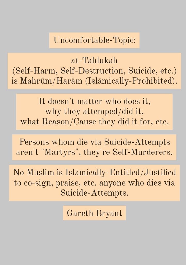 As someone who’s literally prevented Others from attempting/committing Suicide (via my Professional&Personal-Life): for anyone to “praise” someone for committing Suicide truly disgusts me entirely. There’s literally nothing via al-Islām which honors or praises anyone to commit any Manifestation of Self-Harm. So, for any Muslim to co-sign this…there’s something fundamentally wrong with them theologically.