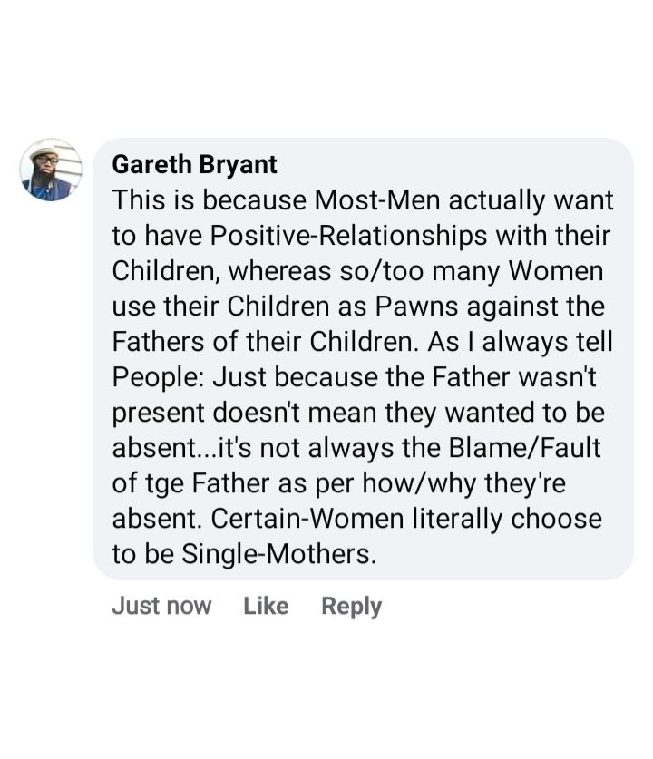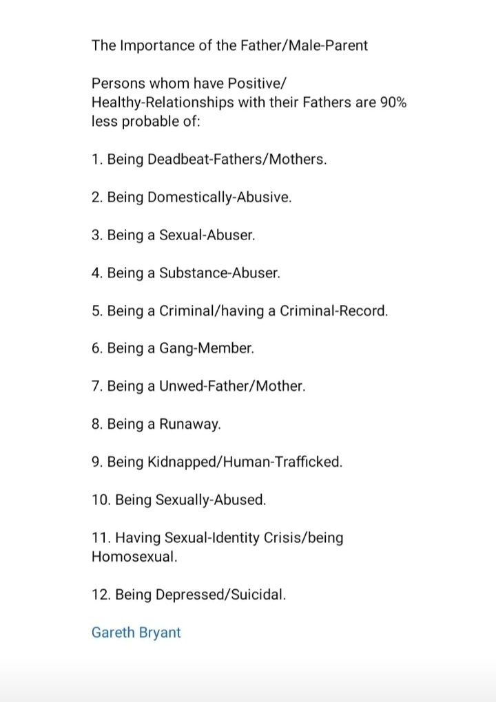 All of these Fatherlessness-Statistics can be verified. Yet, sadly, these Various-Facts are shamelessly denied. The Question is how/why. It’s exclusively predicated upon Agendas to control Others. Those whom aim to control Others know that the Lack of Patriarchal-Guidance is one of the Leading-Causes of Societal-Breakdown of any/all Societies. The Absence/Debasement of the Father/Male-Rolemodel creates Voids via the Lives of Persons & then they’re left to gravitate towards Negative/Toxic Groupings, Environments, Entities, etc. which provide the Illusionary-Compensations for not having Fathers/Male-Rolemodels in their Lives.