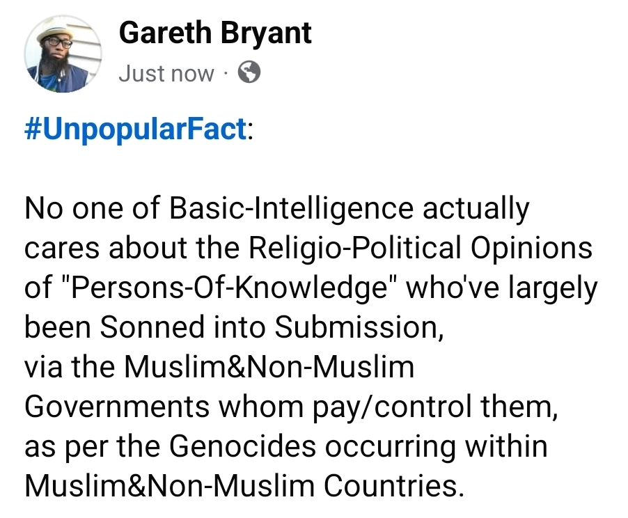 These so-called “Persons-Of-Knowledge” attempt to marginalize the Truth/Honesty I convey by claiming they don’t “approve” of how I choose to convey Things. Of course, this is a Deflective-Ploy: a Pseudo-Justification to attempt to “ignore” & “reject” the Religio-Academia of Gareth Bryant. Persons like these so-called “Persons-Of-Knowledge” attempt to “monopolize” al-`Ilmiyyah/Islāmic-Knowledge, as though al-`Ilmiyyah belings to them and those whom Religio-Academically control them & those like them via Religio-Academic Feudalism.