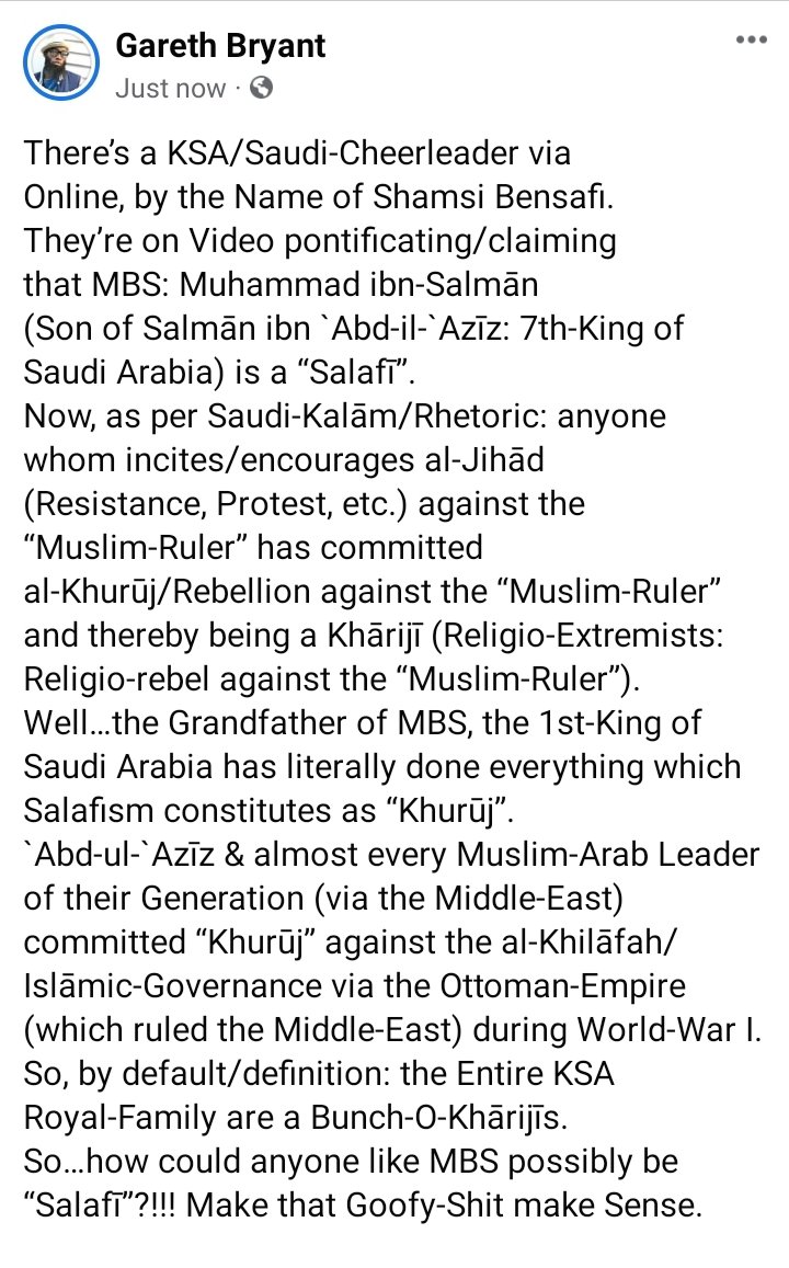 Now…keep in Mind: this Clown-Ass Nigga Shamsi Bensafi literally pontificated/claimed publicly, that MBS (Muhammad ibn-Salman) is a “Salafī”. Da Fuck Part o da Minhāj is this?!!! Make that Goofy-Shit make Sense.