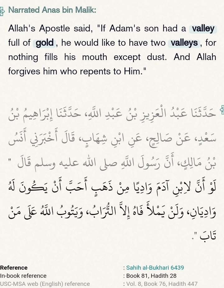 Muhammad (Peace be upon them) stated: “If the Son-Of-Adam were granted a Valley-Of-Gold, then they’d immediately yearn for 2-Valleys just like it. And there’s nothing which’ll satiate their Greed, except Dirt in their Mouth. But, Allah justly accepts whomever repents”.
