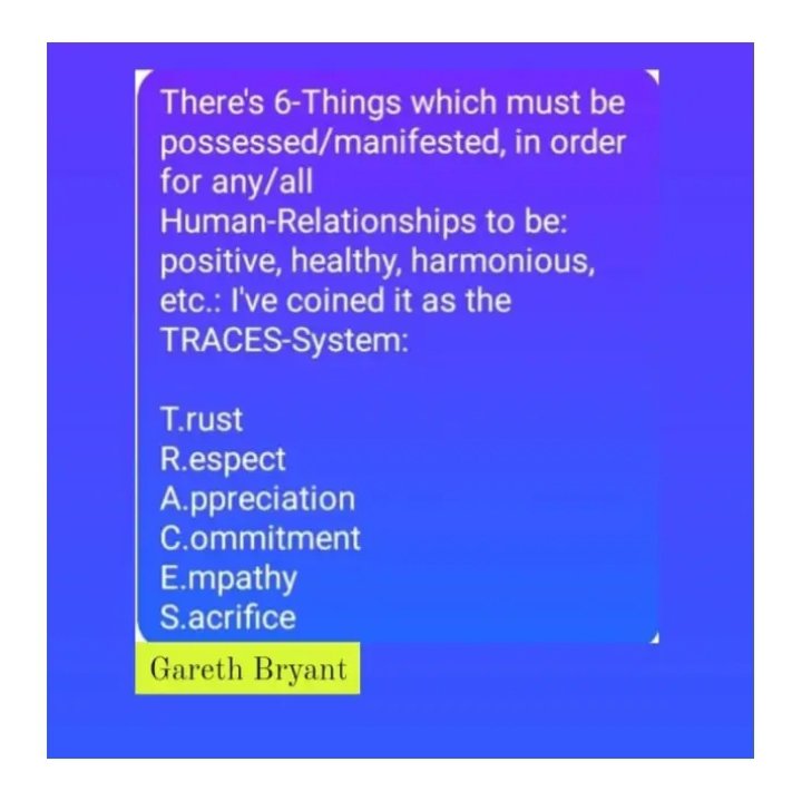 These 6-Things must be had at All-Times, in order for Human-Relationships to prosper. Respect is the Most-Important amongst the 6-Things. Without Respect the Other-5 can’t exist via any Human-Relationship. And, it’s very easy to notice within Others, if/when any of the 6-Things aren’t being manifested. We too often think that we can “settle” for less than All-6. That’s completely incorrect to have such a Mindset. It’s because, if we compromise 1-Thing, eventually we’ll compromise All-6 Things.