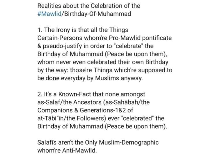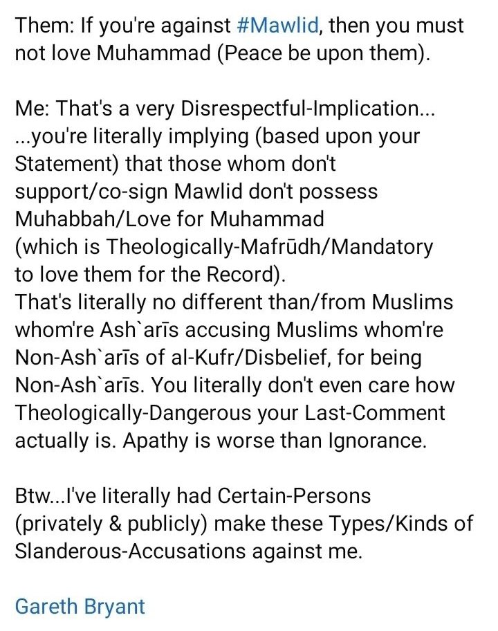 For any Muslim to pontificate, claim, imply, question whether or not any Fellow-Muslim whom doesn’t co-sign Mawlid (the Celebration of the Birth of Muhammad) loves Muhammad (Peace be upon them)…