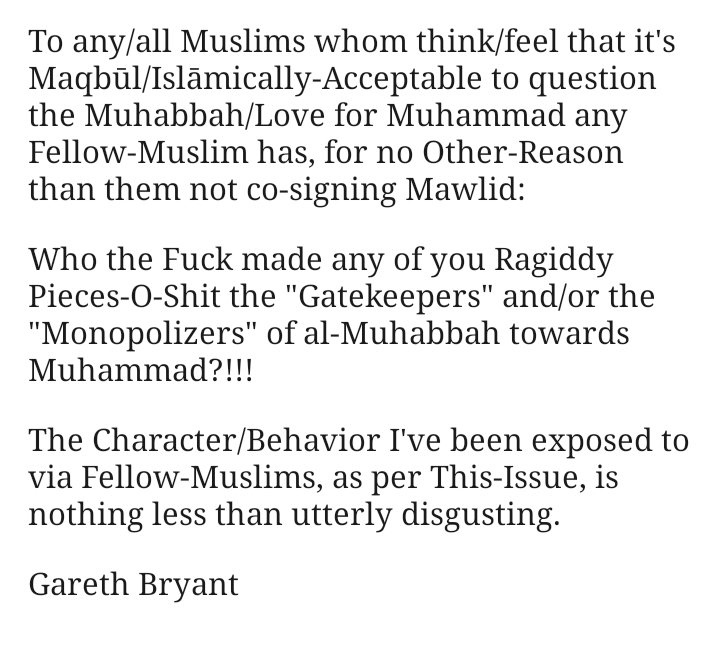 However, This-Year was very different. I’ll explain what I mean. It was the 1st-Time that any Fellow-Muslim ever had the Nerve to “question” my Love for Muhammad (Peace be upon them), simply because I refuse to Dick-Ride the Mawlid-Frenzy. And, this is where the Shit-Show begins.