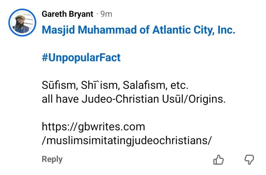 This-Risālah/Article is predicated upon 3 Particular-Ahzāb/Sects, amongst the Muslims, throughout the Muslim-World from Pasadena2Madīnah. Each of these 3-Ahzāb (both historically and equally contemporaneously) have influenced/dominated much of what’s perceived to be al-Islām. My Jadl/Argument is that contrary to Religio Urban-Legend: Shī`ism, Sūfism, Salafism, etc. draw more from Judeo-Christianity as opposed to al-Islām.