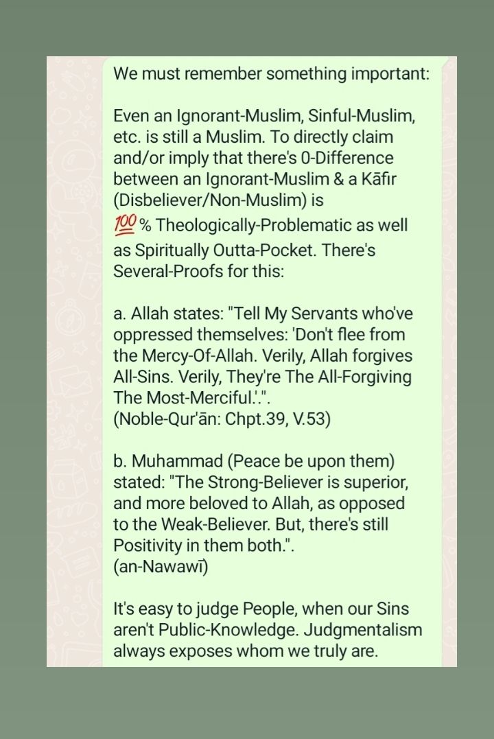 Realistically, if I don’t/refuse to regard any Fellow-Muslim as my Religio-Spiritual Equal: it’s easy to subject them to Theft, Rape, Murder, etc. witgout having any Type/Kind of an-Nadam (Remorse/Regret). Takfīr/Blasphemy-Culture & Tahzīb/Heresy-Culture amongst Muslims causes this directly as well as particularly (albeit to be just/fair not exclusively). Takfīr/Tahzīb-Culture are Terriying-Realities. This is predicated via Refutation-Culture amongst Muslims. This “You’re off da Minhāj”…”You don’t have Correct-`Aqīdah”, etc.: these Damning/Damaging-Accusations against Fellow-Muslims are literally like issuing Religio-Contracts out on Others. I’ve literally been “refuted” via Various-Ahzāb. These-Types/Kinds of “Refutations” against Fellow-Muslims have literally caused Countless-Muslims to: