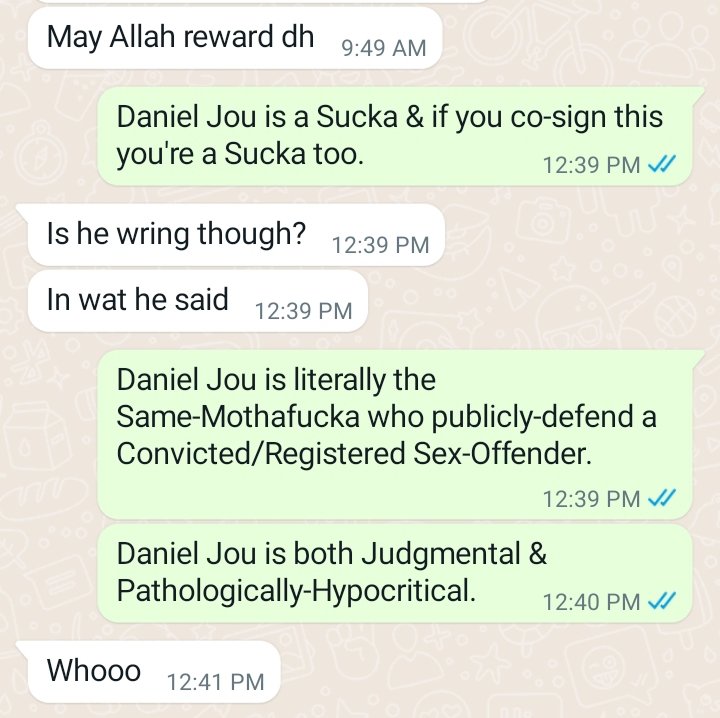 I’ll now get into the Nifāq/Hypocrisy of Daniel Jou, as per whom they judge & whom they don’t. I directly confronted the Person whom sent me This-Video. Sadly, they, like Countless-Others: they’re a “Daniel Haqiqatjou Dick-Rider”. So, them & myself went Back&Forth as per the Sent-Video.