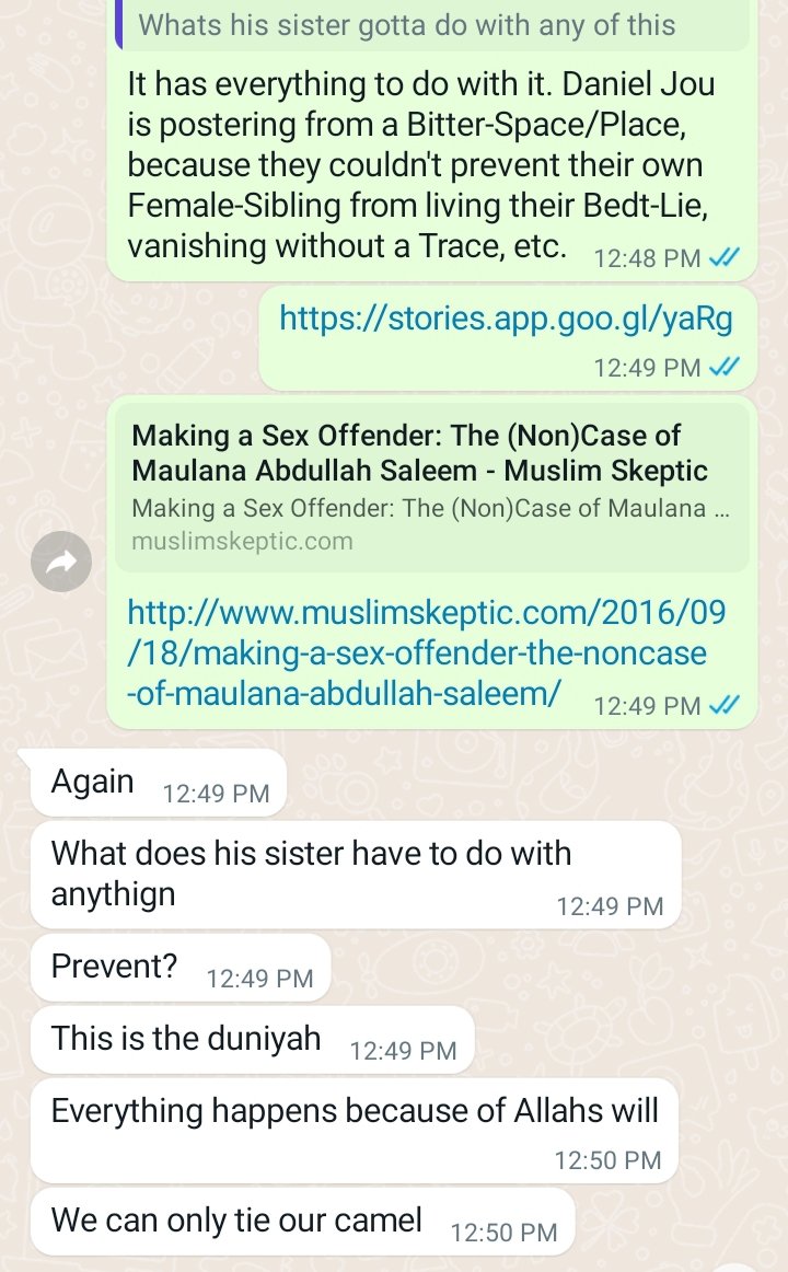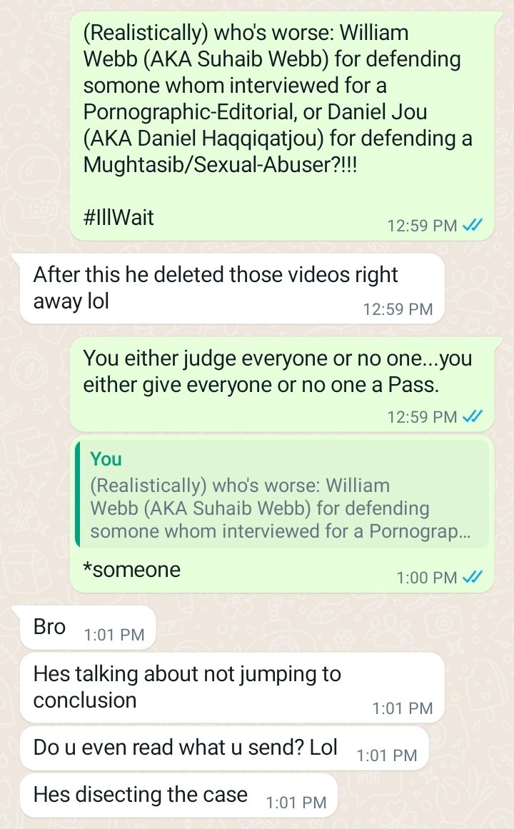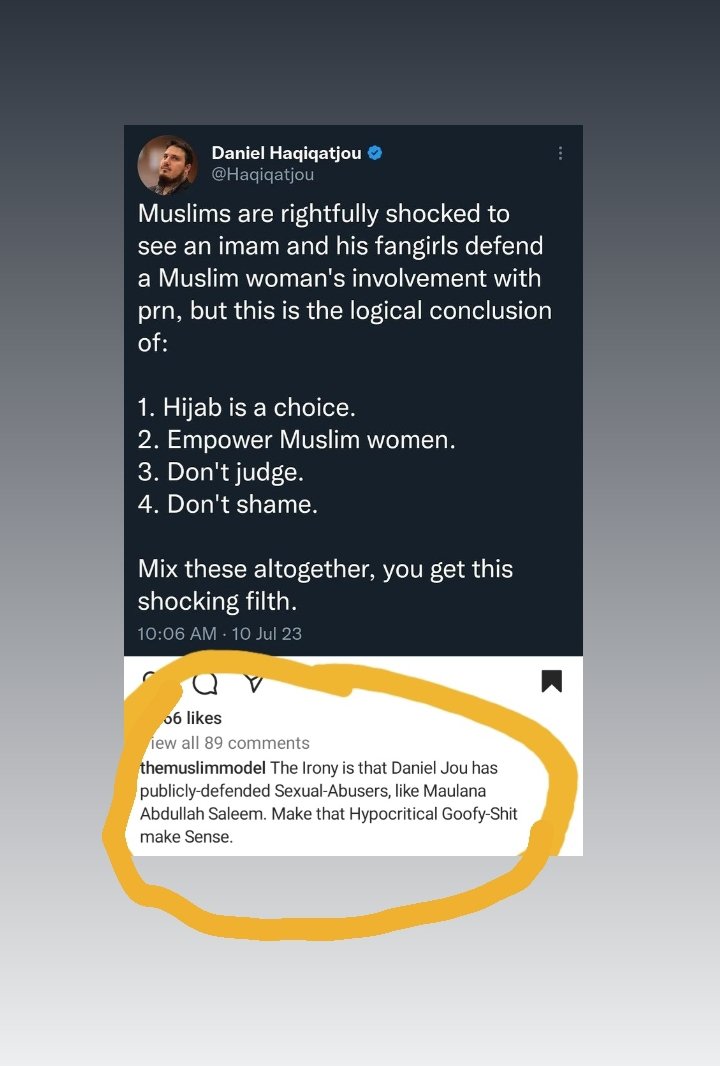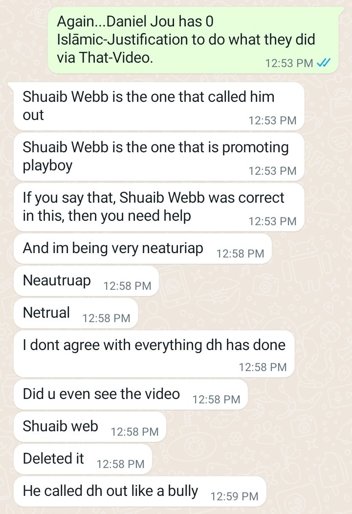 Islāmically, even if someone is a Fāsiq/Public-Sinner, the Most-Correct-Opinion is always to give Confidential-Nasīhah/Correction firstly. And if that doesn’t work, then it’s to be taken further. Now…don’t get me wrong: I publicly took Issue with Noor Tagoori doing the Playboy-Interview as well, which William Webb & I discussed also. However, for Daniel Jou to directly-imply that Noor Tagouri “posed” for Playboy: not only was that Untruth/Dishonesty, but likewise it was al-Buhtān/al-Humazah (Slander/Defamation). But, here’s the Irony: Daniel Jou has 0 Islāmic-Entitlement/Justification to judge anyone as per at-Taqwā/Morality. Daniel Jou has literally publicly-defended a Confirmed/Convicted Mughtasib/Sexual-Abuser…we’ll get into that later though.