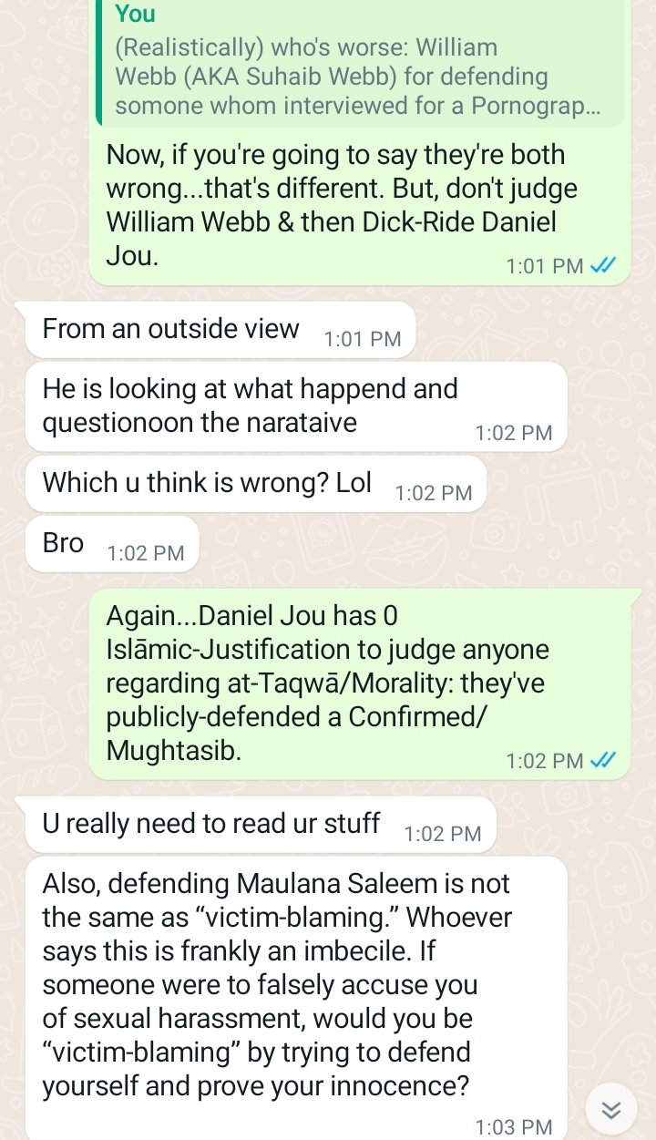 The Person I had This-Convo with: they literally bailed, because all they knew how to do was Dick-Ride Daniel Jou. They obviously didn’t know this, but I know William Webb personally. So, as soon as I wrapped-up the Convo I had with them, I immediately contacted William Webb. Them & I actually had a Fruitful-Convo about this apparent “Daniel Haqiqatjou vs. Suhaib Webb” Muslim-Sphere Rap-Beef Fitnah/Drama. They themselves expressed that they’re grateful for the Discourse between themselves & Daniel Jou. I can clearly see how/why they’re grateful as per the Experience. It most definitely served as an Opportunity, to clarify what’s really the Entire-Deal. And, to no Surprise: Daniel Jou without Fail made themselves look exactly like how they truly are…an Apathetic-Asshole.
