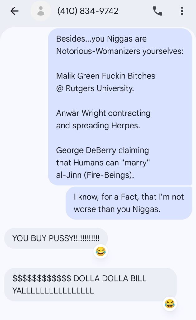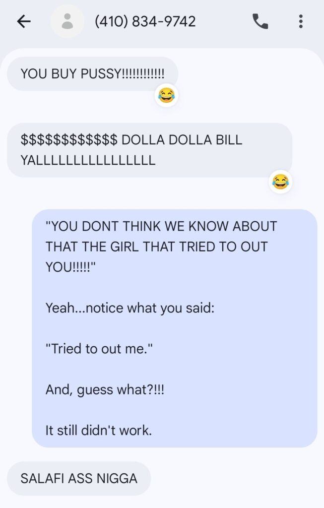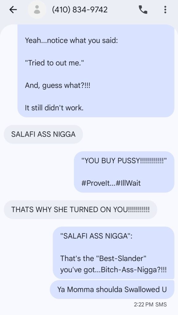 There’ve been Muslim-Men who’ve co-signed Allegations against me, as per me “harrassing” Muslim-Women, all because they wanted to fuck those same Muslim-Women just like I did. It’s just that they never had the Balls to throw da Frank @ em like I did. (Ironically) many of these Muslim-Women are known/notorious to sell Pussy to Muslim-Men and/or fuck Non-Muslims, and whom these Simp-Ass Clowns have pontificated/claimed to their “Defenders” (in the Hopes of getting Sympathy-Yams from said Muslim-Women). But, here’s the Irony: the Broads these Simp-Ass Niggas “defend” don’t even want Those-Dudes. Women never respect Simps, rather they’ll only tolerate/use them as per their own Aspirations/Agendas.