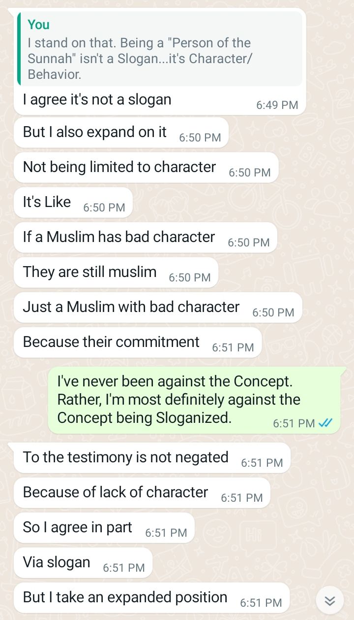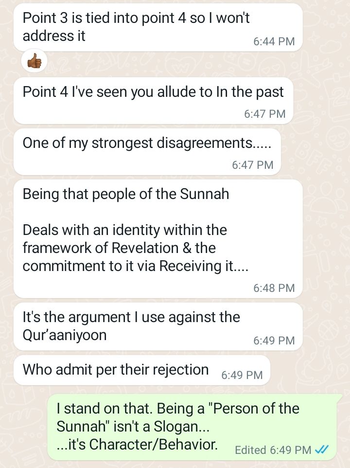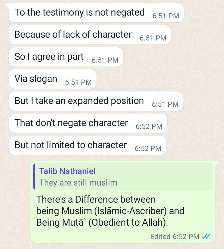 Tālib Nathaniel admitted, that Gareth Bryant presented Strong-Arguments, as per what’s been aforementioned via This-Article. And, equally, after elaborating my Argument to them: Tālib Nathaniel very much agreed with the Argument which Gareth Bryant present regarding this. I await Tālib Nathaniel’s Response-Article to This-Article, as they mentioned they’d author a Response. Tālib Nathaniel informed Gareth Bryant their Response-Article will be based upon their Research of the Works of at-Tahāwī (regarding whom does vs. whom doesn’t qualify being classified as “Persons of the Sunnah”).
