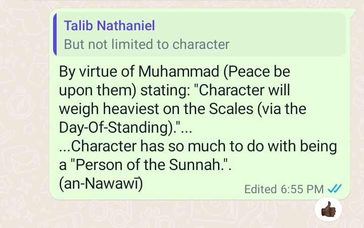 Tālib Nathaniel began stating that even a Person of Negative-Character/Behavior can still be classified as a “Person of the Sunnah”. I strongly contested that Type/Kind of Madhab/Posture. Gareth Bryant’s Evidence is explained via the Statements of Muhammad (Peace be upon them):