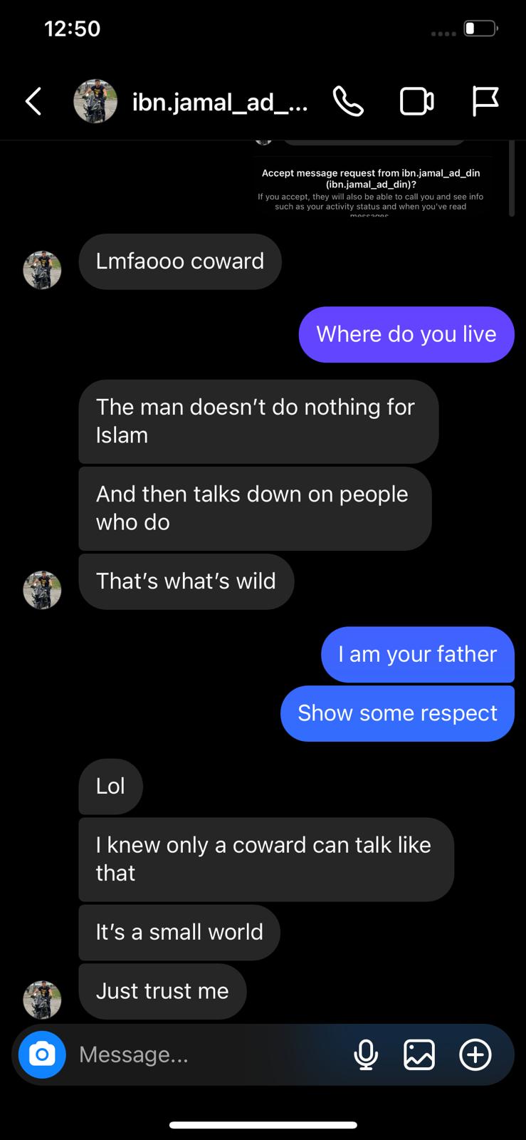 When Badees sent These-Screenshots to me, I was truly shocked by their Joint-Exchange & equally alarmed/disappointed at the Responses of Badees towards/against Zia. I literally expressed/verbalized my Disappointment Word4Word to Badees and personally admonished Badees’-Responses to Zia directly. I also in turn reached-out to Zia to remind them that to threaten any Fellow-Muslim is a Kibār/Major-Sin, and that it’s particularly heinous to do so during the Month-Of-Ramadhān. Now, you’d actually think that Zia would’ve respected what I stated to them. Surprisingly…No: This-Mothafucka begins ranting&raving towards me, pontificating/claiming that I was “defending” Badees which is 💯%-False/Dishonest. Then, they began threatening me the Same-Way they were threatening Badees. Zia attempted to present a Pseudo-Justification to threatening Badees, claiming that they were “mocking” their Dead-Father. Now, in spite of the Fact that Badees was Dead-Ass Wrong for initiating and/or triggering the Anger of Zia regarding their Dead-Father: