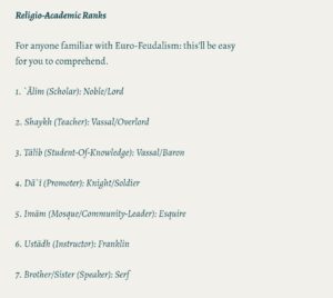 al-Muqaddimah/Prelude This-Risālah/Article is a Sharh/Commentary of what I’ve previously authored, regarding “Shaykh-Culture”, “Persons-Of-Knowledge” Mythos, the “Muslim-World Caste-System”, etc. What Exactly is a Student of Knowledge – Talib ul ilm They never wanted People to beIndependent of their Puppet-Strings. “Student-Of-Knowledge Fail”#GotEm…👳🏾🤦🏾😫😂 Let’s explore Religio-Academic Feudalism What’s “Religio-Academic Feudalism”? Good-Question… …Answer: Religio From Religion: word-forming element used … Continue reading The Religio-Pathology known as Religio-Academic Feudalism