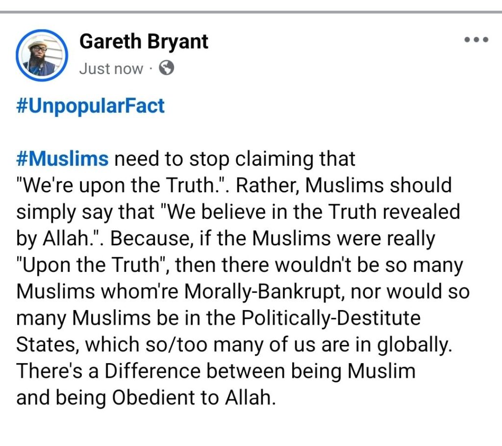 Gareth Bryant has stepped on the Toes of Lots of People, as per their Religio-Sectarian Callouts. They’ve gotten into Countless-Arguments, they’ve almost gotten into Countless Physical-Altercations, they’ve been threaten Countless-Times via Cowardly-Muslims, they’ve been slandered via Cowardly-Muslims, etc. And, obviously, I’m not the 1st-Muslim this has occurred to nor am I the Only-Muslim this has occured to. It’d be great, if I were the Last-Muslim this has occurred to. It truly pains me spiritually, that any Muslim gets tested via Fellow-Muslims via This-Fashion. No Muslim should ever have to be in any Position where their Religio-Spiritual Dignity is question. But, sadly, it’s an Everyday-Reality.