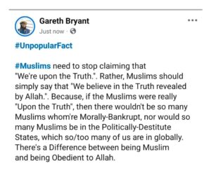 Allah states: “Those whom believe pay attention: Revere Allah & speak a Straight-Word.” (Noble-Qur’ān: Chpt.33, V.70) Muhammad (Peace be upon them) stated: “Always speak Truth, even if it’s bitter (even if it rubs People the Wrong-Way).” (ibn-Hibbān&al-Bayhaqī) al-Muqaddimah/Prelude Gareth Bryant has stepped on the Toes of Lots of People, as per their Religio-Sectarian Callouts. They’ve … Continue reading Concepts/Terms which Muslims attempt to monopolize for their own Sectarian-Agendas