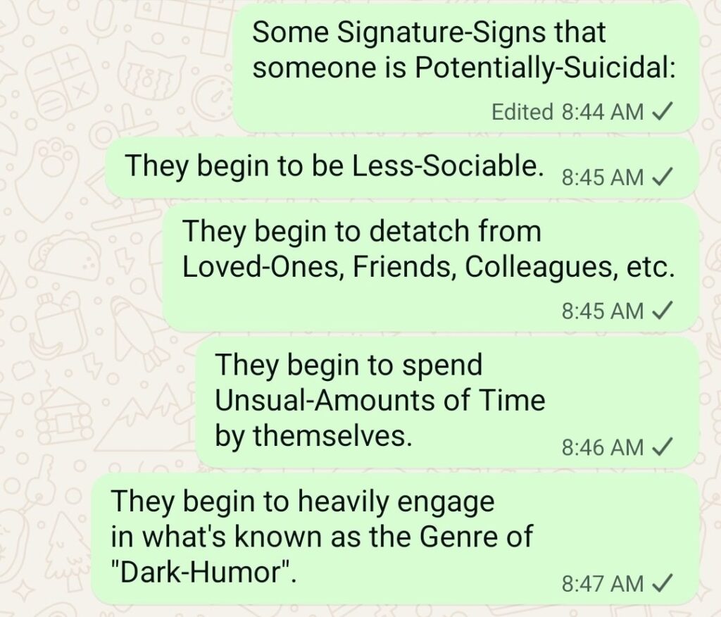 As per what I’ve aforementioned, via the Pic concerning “wanting to die”: in All-Truthfulness/Honesty, it’s a Misnomer. I’ll explain what I actually mean. Even if/when anyone becomes and/or is Suicidal: they don’t actually want to die…they really only want their Suffering, Life-Challenges, etc. to die. However, Suicidal-Persons (for Various-Reasons) allow ash-Shaytān/Satan to convince them that the Only-Way to end their Suffering/Life-Challenges are to end themselves. Speaking of Suicide, as per my Professional-Experience: there exists a Strong-Correlation between Suicide & Sexual-Abuse. At least 98% of Persons I’ve counseled regarding Suicide were sexually-abused (at least once via their Life-Times). Being Suicidal is literally a Person’s Last-Call for Help…it’s actually a Spiritual/Psycho-Emotional S.O.S.-Signal. This is the Reason how/why the Average-Suicidal authors what’s known as the “Suicide-Note”. They do this to catch they Attention of at least 1-Person who actually cares enough to reach-out to them, to stop/prevent them from committing Suicide. For example: the Famous-Series “13 Reasons Why”, which is literally based on a True-Story/Actual-Events by the way: I’ve literally seen almost all the 13-Reasons manifested via Other-People I’ve actually counseled. I mean, via the Nasr/Help-Of-Allah: I’ve literally been able to physically prevent People from threating/attempting Suicide rite in front of me via Real-Time & via Real-Life.