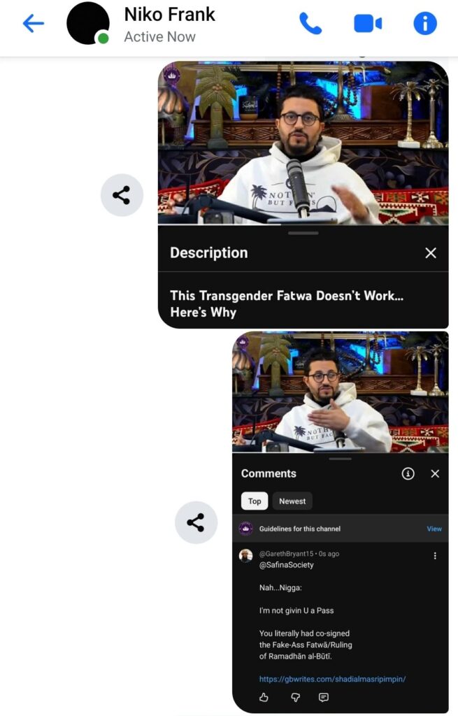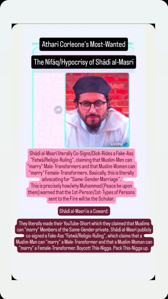 Amīn Muhammad is a Fake-Shaykh, compensating for them being a Hasbeen Street-Nigga. They brought their “Fake-Tough” Manufactured-Mindset with them, as they’ve been living as a Muslim. You can’t be al-Ghazālī & John Gotti at the Same-Time. You can’t be ibn-Taymiyyah & Al Capone at the Same-Time. You’ve got to pick One or the Other my Nigga. But, of course them & those like them want to perpetrate the Fraud as though they’re a Kingpin-Scholar or something like that.