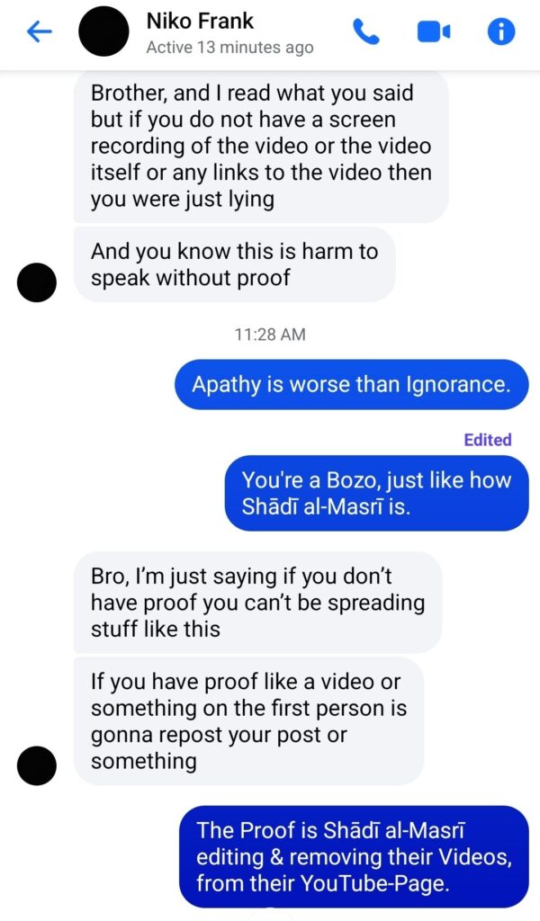 Shādī al-Masrī has the Audacity to call Shabīr `Alī a Mubtadi` (Innovator) as well as a Zindīq (Pathological-Sinner). Yet, they directly co-sign Amīn Muhammad who’s a Notorious-Liar, Notorious-Slanderer, Notorious-Takfīrī, etc.