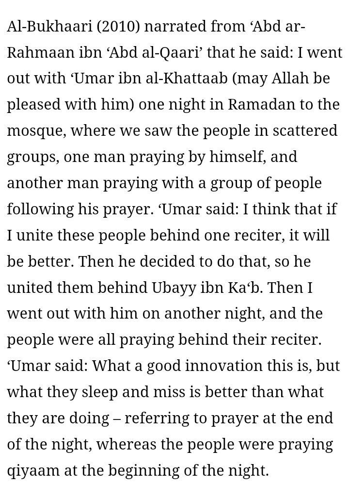 It’s very obvious, via the Word-Usage: `Umar ibn-il-Khattāb was clearly being Highly-Sarcastic. There’s 0-Way, that al-Fārūq/the Critic (the Title which `Umar was known by) would ever co-sign any Bid`ah. However, there’s Muslims who’d dare assume that `Umar actually co-signing al-Bid`ah. And, because of this: the Muslims want to use `Umar’s-Statement, as a Pseudo-Justification, to pontificate/promote al-Bid`ah. Ironically, the Scenario of `Umar ibn-il-Khattāb stating “Bid`ah-Hasanah” was only uttered for this 1-Instance. But, there’s been Countless-Muslims since That-Time, sadly, who’ve deliberately committed at-Tahrīf/Distortion as per the Statement itself. And, they’ve purposefully inflated, exaggerated, the Context of the Statement to be manipulated/abused to suit/fit their own Devices/Desires.