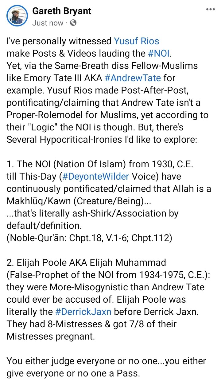 As I always tell People: You either judge everyone or no one…you either give everyone or no one a Pass. As a Muslim: for any of us to co-sign the NOI, knowing damn well that they call People to Pseudo-Islām, via ash-Shirk: by default we’re not even Islāmically-Justified to be vocal against any other Non-Muslims whom pontificate/promote ash-Shirk. How dare we judge any other Non-Muslims whom calls People to ash-Shirk, yet when the NOI does it we conveniently turn a “Blind-Eye”?!!! Make that Goofy-Shit make Sense.