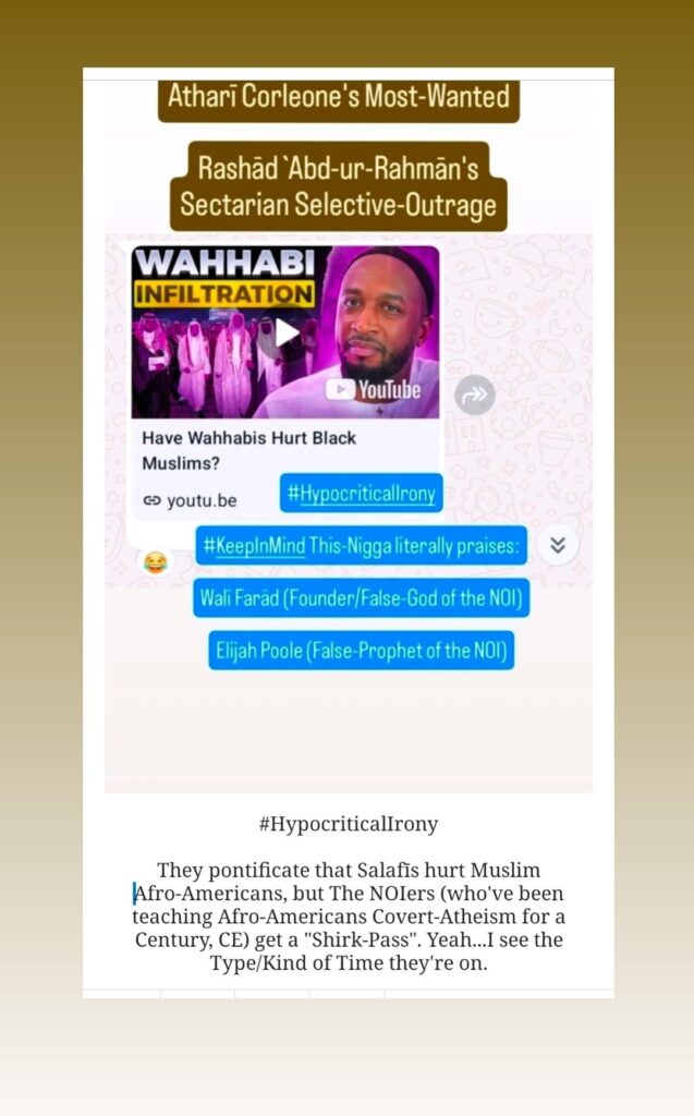 Especially amongst Muslim Afro-Americans: the Only-Reason how/why there’s Certain Muslims whom give the NOI a Pass is because they’re “Black-People”. It’s a Non-Debatable Fact, that NOI-Theology directly mimics Judeo-Christian Theology. Yet, ironically, Certain Muslim Afro-Americans are significantly less hostile towards the NOI as opposed to Other Non-Muslims. How’s it even possible to give 1-Group of Non-Muslims Theological-Passes when they commit the Same-Types/Kinds of Theological-Atrocitues as any other Non-Muslim & are just as Islāmophobic as any other Non-Muslims?!!! Because, without any Doubt: anyone whom pontificates/promotes ash-Shirk against Allah is an Islāmophobe by default/definition.