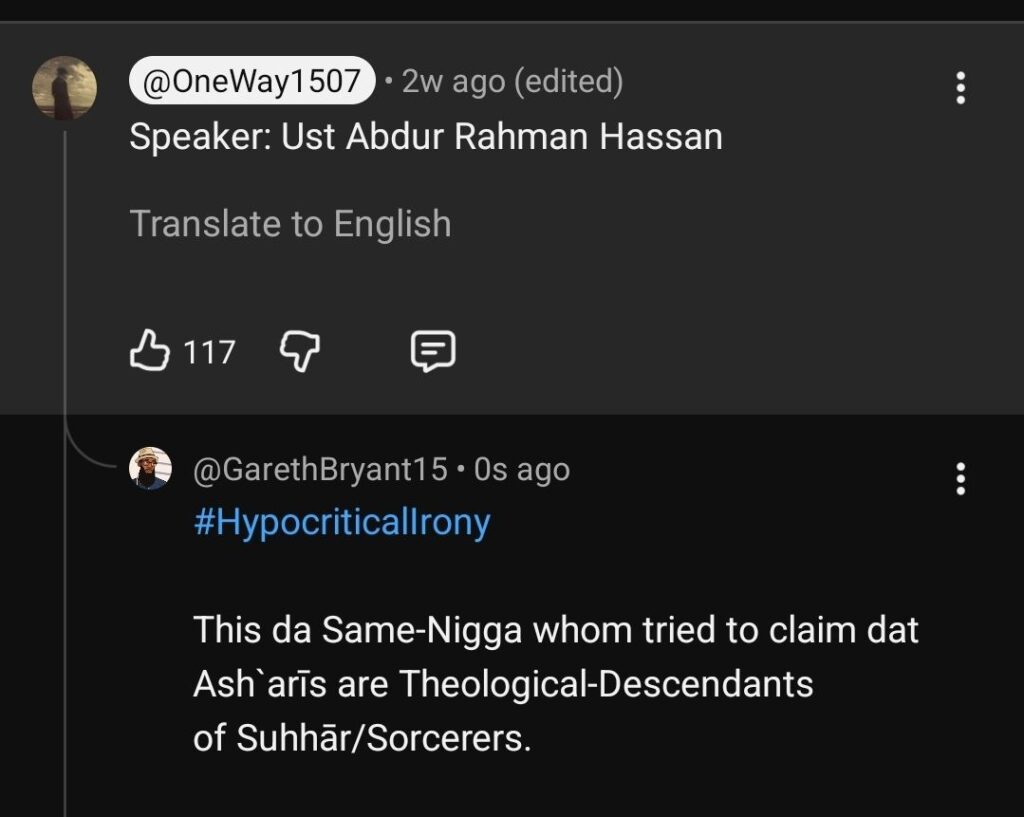 When I first saw the Post of Abī-Muhammad al-Mālikī: I was 💯%-Disgusted. What angered me even more intensely were Other-Ash`arīs whom not only co-signed such Theological-Slander agsinst Fellow-Muslims…these Clown-Ass Niggas literally congratulated Abā-Muhammad for posting such Theological-Slander. Of course, Gareth Bryant being whom they are-I personally/purposely confronted Abā-Muhammad via their Insidious-Post, as well as via FB-Messenger. FYI: that Bitch-Ass Nigga blocked me as well.