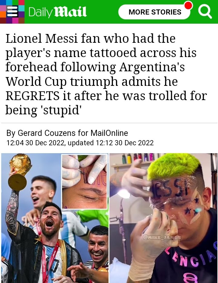 Colombian influencer Mike Jambs inked the word Messi on his forehead, three stars on one of his cheeks for each of the World Cups Argentina has won and D10S on the other which is a combination of the Spanish word for God with the player’s famous number 10 shirt.