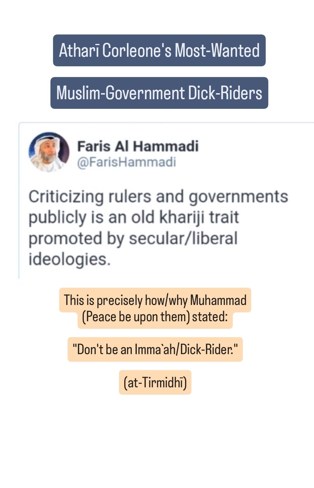 So, apparently, according to this Clown-Ass Nigga Fāris al-Hammādī the Following-Individuals were all Khārijīs/Religio-Extremists because they all did precisely what Fāris al-Hammādī is bitchin&moanin about: