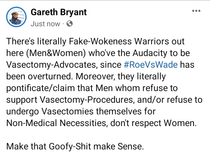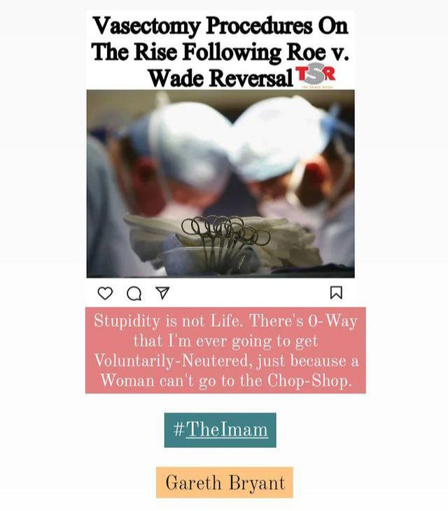 This Narrative of Men flooding Medical-Centers, to acquire Vasectomies, is quite emasculating honestly. Vasectomy is most definitely a Method of Population-Control. I honestly can’t imagine any Man actually wanting to do this. I’m personally triggered, if/when the Subject of Vasectomy comes-up. And, the Issue of Roe vs. Wade has been the Reason/Cause of Men wanting to get Vasectomies is truly pathetic. Men really need to grow a Pair (#PunIntended) & stop trying to take the Easy-Way out.