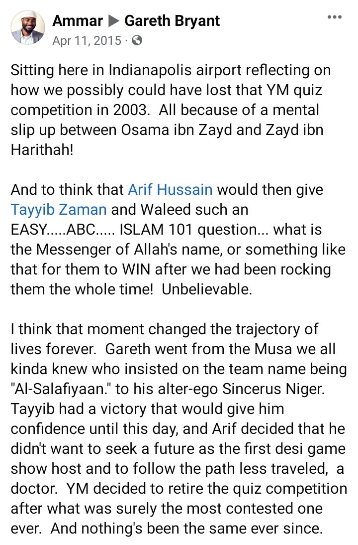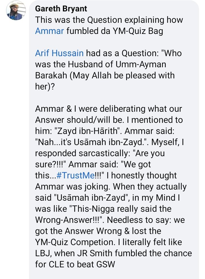 For anyone whom remembers the YM-Quiz Competitions, via ICNA-Conventions: they were dope, epic, legendary, etc. By far, the most memorable of those Quiz-Competitions was in 2003, C.E. when Gareth Bryant & `Ammār Ādam teamed-up as “as-Salafiyān/2-Salafīs”…Yeah we were really like that back in Those-Days/Times. We were both really On-One with the Pettiness. `Ammār & myself had always semi-competed with/against each other. But, that Particular-Year: we literally shocked everyone & teamed-up with each other for the then Annual YM-Quiz Competition. Yo…we were literally smoking our Competition. It ended-up coming-down to our Team & Another-Team. Both Teams had the Best Quiz-Competitors Hands-Down. And, during the Quiz-Finals: Both-Teans were literally going Back&Forth, Question/Answer4Question/Answer, Point4Point, etc. It was awesome…you just had to be there.