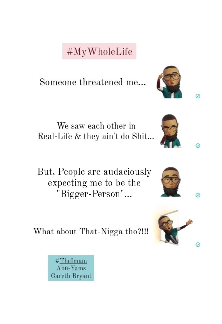 I don’t pontificate/claim to be a “Person of the Sunnah/Prophetic-Tradition”, by any Means. However, when it comes to this Aforementioned-Hadīth/Narration rite here: I make it my Personal-Business, to follow This-Hadīth to the utmost. Now, obviously, there’s Certain-Things which I could/should convey better. But, Fuck-It…I say it how I say it. There’s Persons whom complain all the Time, referring to what my Post-Wording is. Well…guess what?!!! I exist to make the Uncomfortable comfortable. Most-People whom’re in Opposition to what I post: it’s a lot more to do with them opposing what I’ve actually mentioned, instead of the Wording itself. It’s really not the Message, but rather the Messenger. 9/10 Most-Persons whom reject whatever we convey: it’s not what’s being conveyed that’s being rejected, but us as the Conveyor.