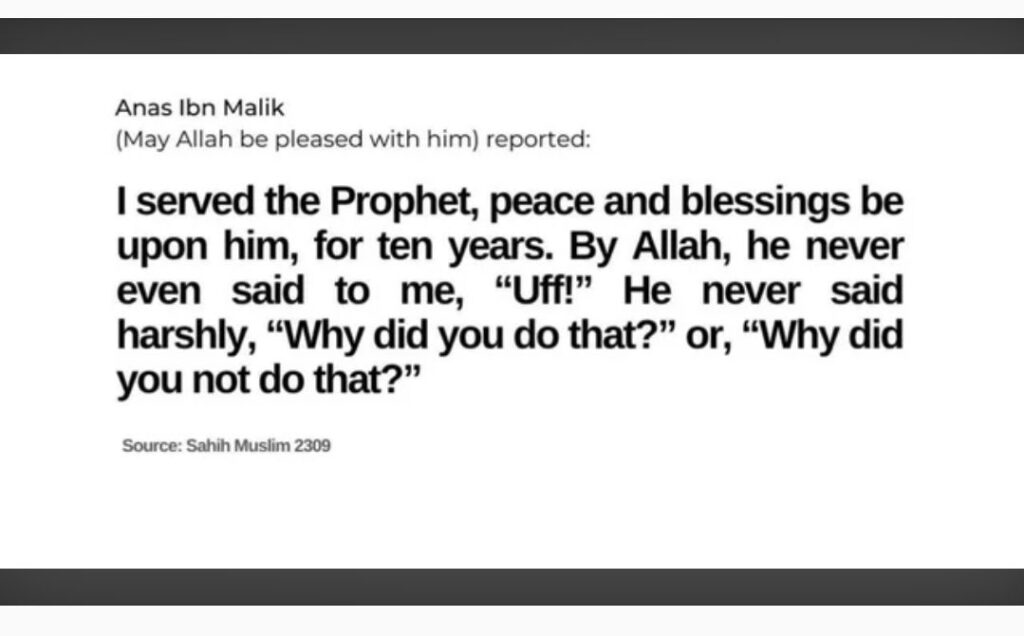 Anas ibn-Mālik literally dwelled in the Home of Muhammad, essentially an Auxilliary-Member of their Ahl-il-Bayt (Prophetic-Household). So, Anas ibn-Mālik possessed & shared an Intimately-Personal Vantage-Point as per how Muhammad ibn-`Abdillah conducted themselves via their Domestic-Life. So, to personally serve anyone for 10-Years and them to never be cursed-out, scorned, ridiculed, etc. is phenominal to say the least.