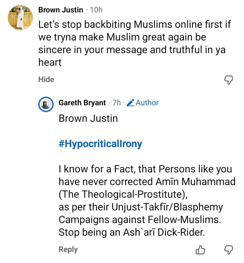 They’re completely apathetic to the Unjust-Takfīr/Takfīr-Culture which Persons like Amīn Muhammad pontificate as well as promote directly. They’re 💯%-Complicity in the Pro-Takfīr Kalām/Rhetoric of Amīn Muhammad against Fellow-Muslims. It’s precisely like what I always tell People: Apathy is worse than Ignorance.