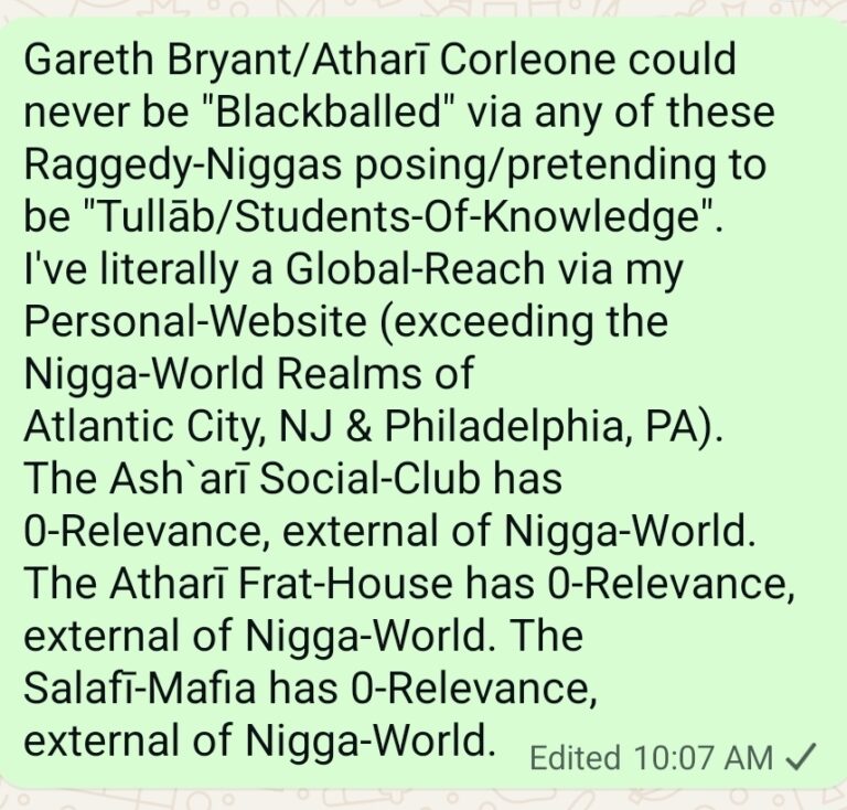 al-Muqaddimah/Prelude The Pseudo-Justification used via the Atharī Frat-House to slander me: twas because I refused to “comply” with what’s mythically known as the “Atharī-Curriculum”. Much to my Suspicions, this “Atharī-Curriculum” is Weak-Ass-Hell (Best-Case-Scenario). I’ll explain how/why I’ve concluded as such So, what’re the Books/Authors associated with the Mythical “Atharī-Curriculum” Kung-Fool Manual?!!! #GoodQuestion… …#Answer: “Lum’at-ul-I`tiqād/Illumination-Of-Beliefs” (`Abdullah … Continue reading Gareth Bryant’s Atharī Proposal to the Atharī Frat-House