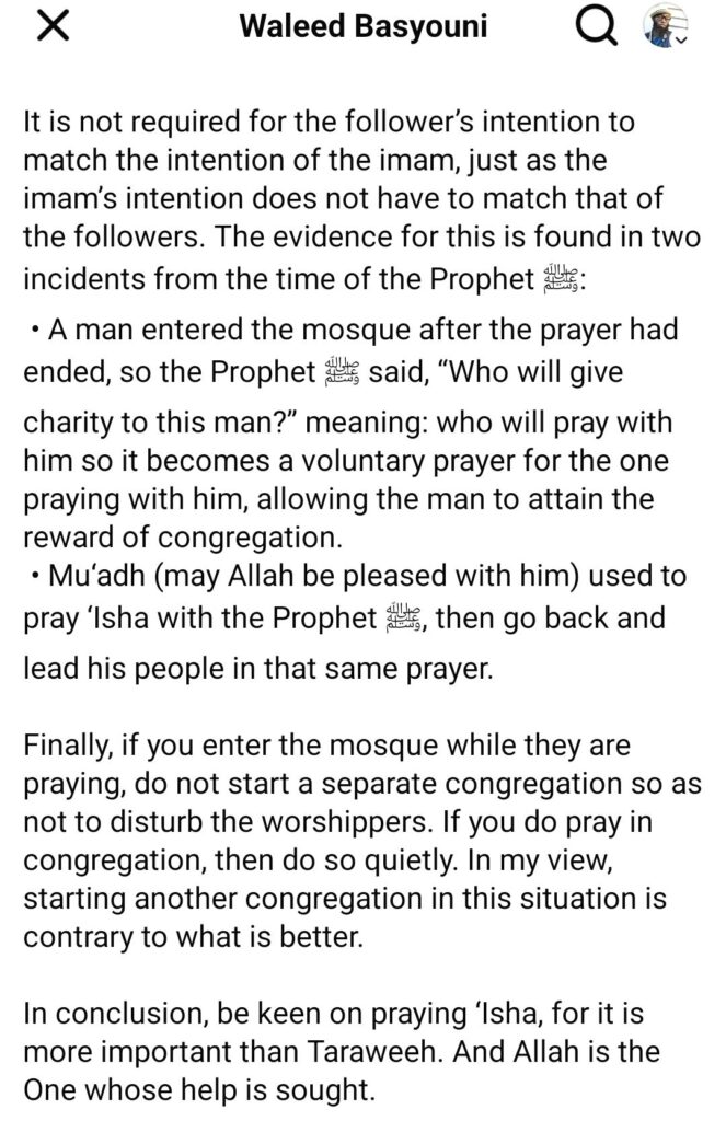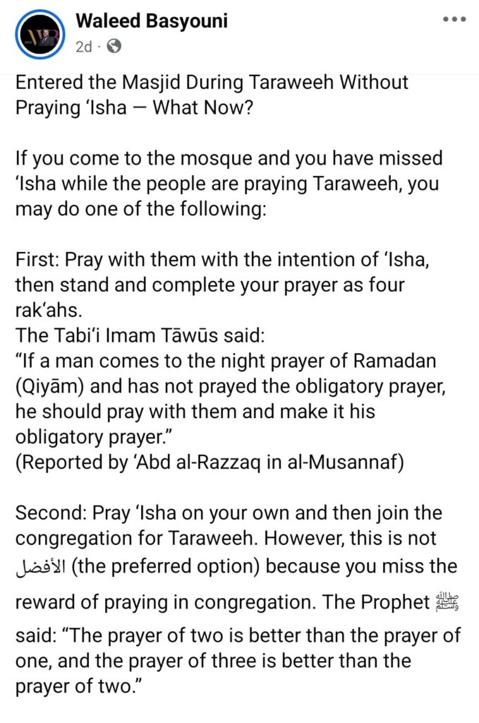 One goes to a Masjid (Mosque) and they’ve missed the Jamā`ah (Congregation) of al`Ishā’ (Nitetime-Salāh/Prayer), and they witness Others praying at-Tarāwīh (Ramadhān Nitetime-Salāh).