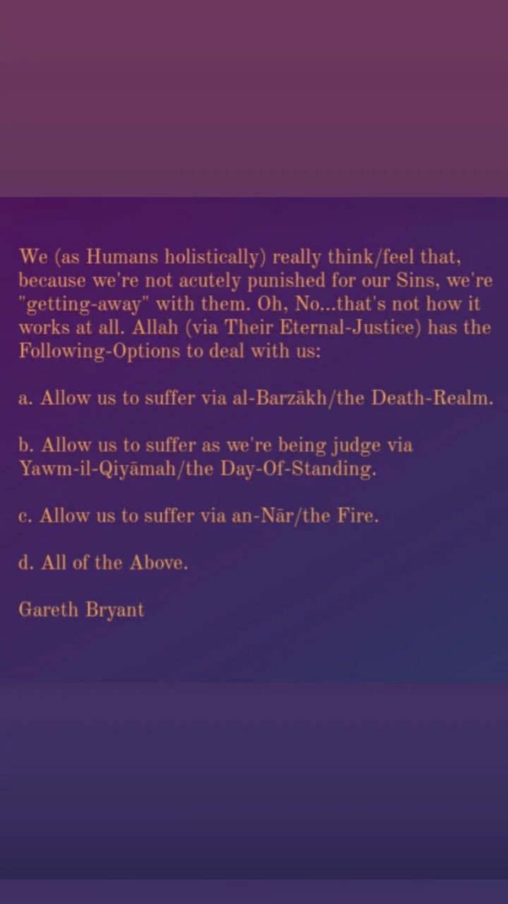This is precisely how/why asking Allah for: ar-Rahmah/Mercy, at-Tawbah/Repentance, al-Maghfirah/Forgiveness, al-`Āfiyah/Pardon, etc. are so essentially important. There’s a Reason how/why one of the Names-Of-Allah is Al-Mu’ākhir/The Ultimate-Delayer. We, as Humans, not getting chastised for Negative-Character/Behavior instantly shouldn’t necessarily make us comfortable…that’s supposed to bother us, because if we don’t catch it here it may very well await us via al-Ākhirah/the Hereafter which’ll be worse realistically.