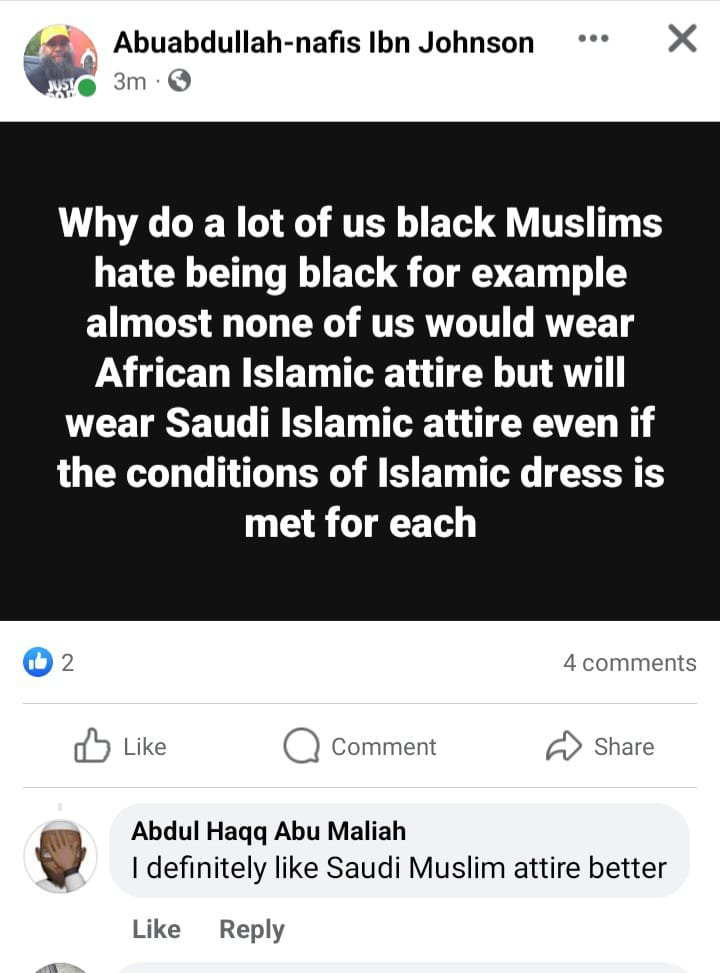 Which brings me to the Fashion-End of things: the “Salafi-Uniform” as it’s known…the Arab-Dress (specifically relative to Gulf-State Fashion-Trends). Thobes, Kufis, etc. And whomever doesn’t don those things are regarded as Outsiders…truly a Cultish-Mindset/Mentality.