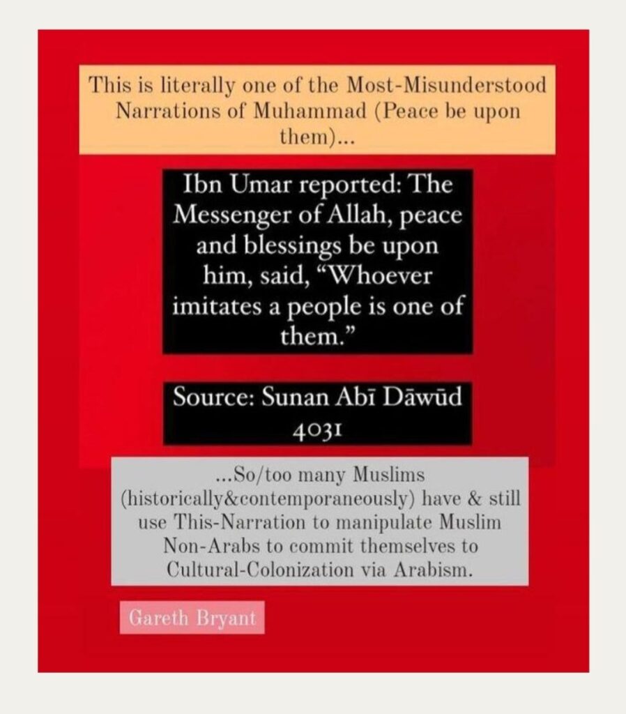 To be even more accurate/honest: al-Islām has never had an `Urf/Culture (not even prior to the Revelation of The Qur’ān). However, al-Islām has always respected (allowed Muslims to have their own) `Urfiyyah/Cultural-Dynamics so long as they don’t oppose at-Tanzīl/Revelation. This is particularly/especially important, because, sadly the Muslim-World has adopted Arabism…as though pontificating/claiming anything related to al-Islām derives from Arab-Culture. This is done both subconsciously & consciously. From unecessarily adopting Arab-Dress/Arabic-Names, to speaking Non-Arabic Languages with Arab-Accents, etc.: literally all of this is a Sifah/Manifestation of al-`Asabiyyah/Xenophobia via Cultural-Colonization.