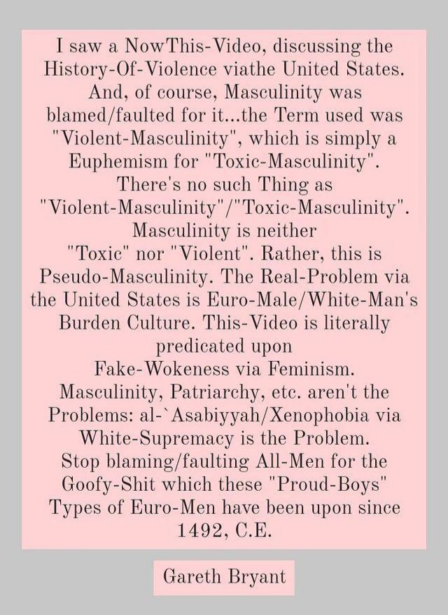 According to Fake-Woker Jackson Katz (a so-called “Gender-Expert”): American-Violence is exclusively because of Masculinity. That’s literally a Fake-Woke Cop-Out. Instead, the Truth of the Matter is that al-`Asabiyyah/Xenophobua via White-Supremacy is the Foundational-Premise of American-Violence. But, of course, since Jackson Katz is a Euro-Male, they won’t admit that since it’d alienate themselves. Rather, they & those like them aim to indict Any/All-Men as if All-Men are “Violent”, “Toxic”, etc. And, quite honestly, that Type/Kind of Kalām/Rhetoric is Complete-Bullshit.